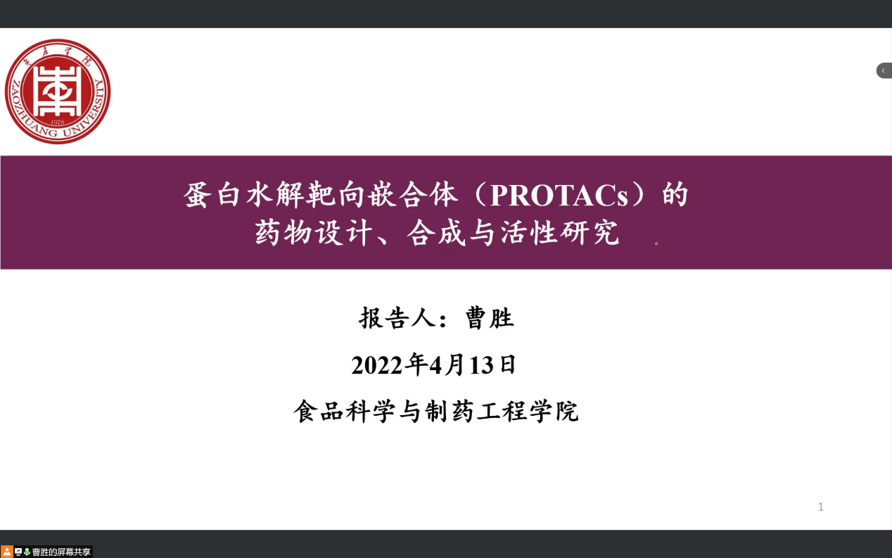 为丰富同学们的专业知识,拓展学术视野,培养学生们的科研兴趣,bat365官网登录入口于4月13日在线上开展题为“蛋白水解靶向嵌合体(PROTACs)的药物设计、合成及抗肿瘤活性研究”的学术报告会。本次报告会由学院专任教师曹胜主讲,20级和21级制药工程专业的学生参加。
