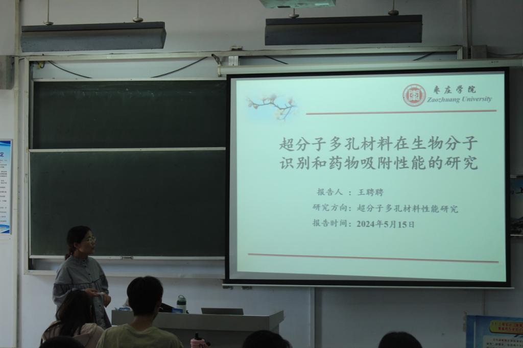 王聘聘博士做了题为“超分子多孔材料在生物分子识别和药物吸附性能的研究”的学术报告。报告以超分子多孔材料的研究背景及意义展开,介绍了基于超分子多孔材料的性能特点和应用领域构筑的新型超分子多孔材料——超分子有机框架(SOF)和超分子配位框架(SCFs)多孔材料,探究了两种材料在药物吸附、分子识别、细胞成像和光动力治疗等方面的性能,并对多孔框架材料的发展前景进行展望。会后,王聘聘与师生们进行了深入的交流,并就师生们提出的问题做出了耐心解答。“药物+绿色合成”团队教师对此次论坛进行了专题交流研讨。