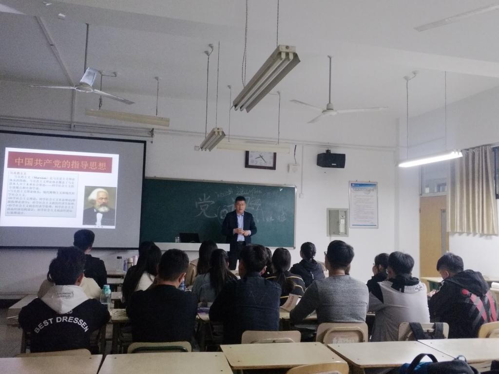 周玉亮首先带领大家共同学习了中国共产党的性质、最高理想和根本宗旨,从共产党的诞生历程、党章的发展历程、中国共产党党内统计公报和中国共产党章程内容等方面做了详细讲解,加深了同学们对“两个先锋队、一个领导、三个代表”、“实现共产主义”和“全心全意为人民服务”等相关知识的理解。然后重点讲解了马克思列宁主义、毛泽东思想、邓小平理论、“三个代表”重要思想、科学发展观、习近平新时代中国特色社会主义思想,具体解释了中国共产党指导思想的具体内涵。