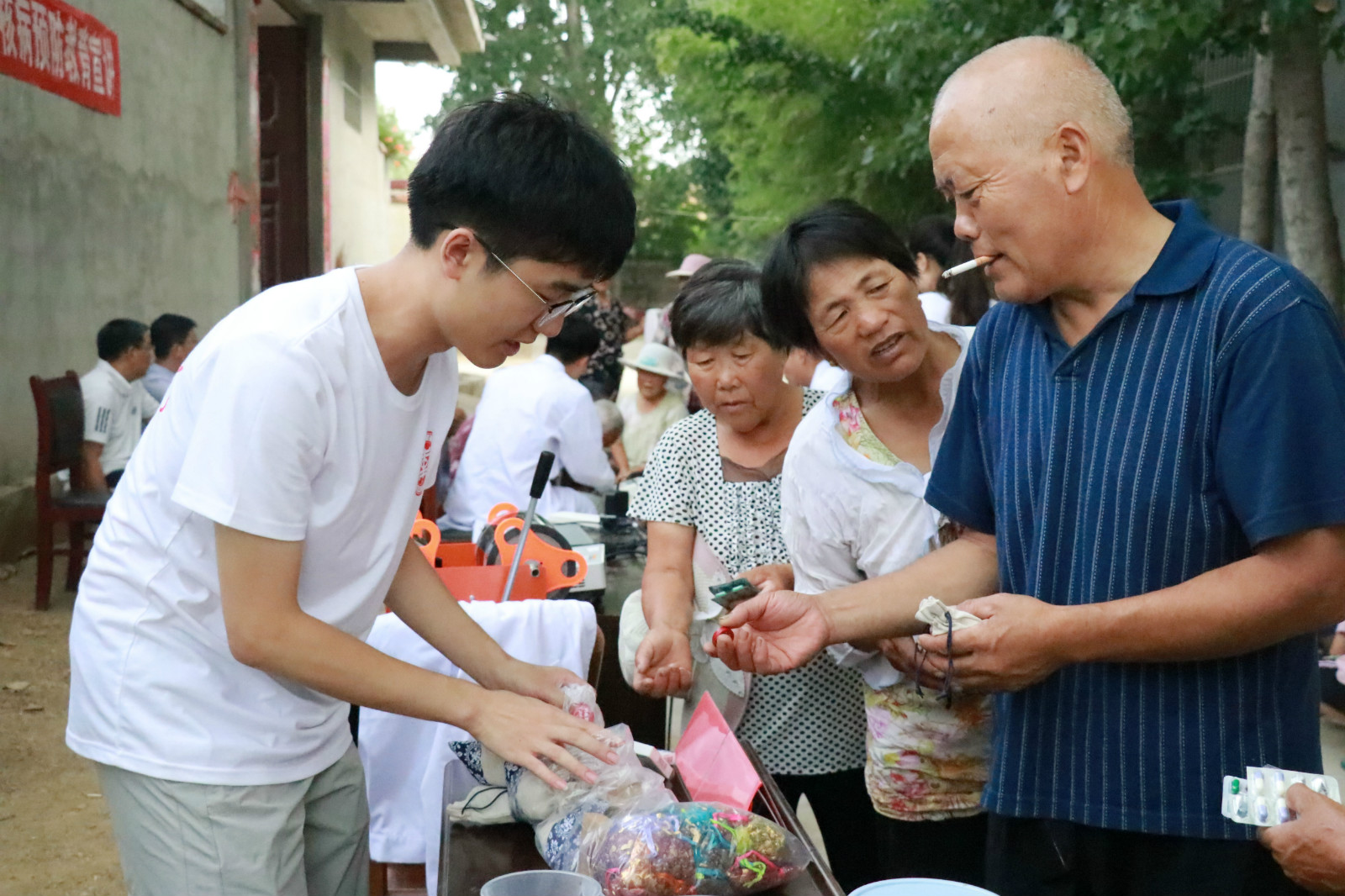 7月15日—17日,社会实践团队一行到达枣庄市薛城区周营镇胡庄村开展社会实践活动。村委会干部表示热烈欢迎,并向实践团队详细介绍地理环境、基础设施及村民健康整体现状,希望志愿者通过本次实践能够深入了解农村居民的普遍健康状况,在志愿服务过程中增强社会责任感,熟练专业知识,并在实践过程中增长经验,收获成长。志愿者在专业老师的指导下,进行“中医药养生保健知识”“艾滋病、结核病预防教育”等健康教育主题的宣讲,补充基本医疗常识,并为村民们测量血压并询问基本用药情况。用过期药品兑换礼品环节,大家积极将过期药品收集起来,并用学院自主研发的清凉凝胶、中草药驱蚊包做交换。志愿者也带去学生创业团队制作的茶包,为村民们泡好解暑的茶饮。