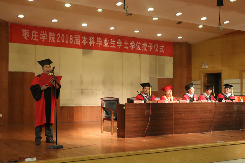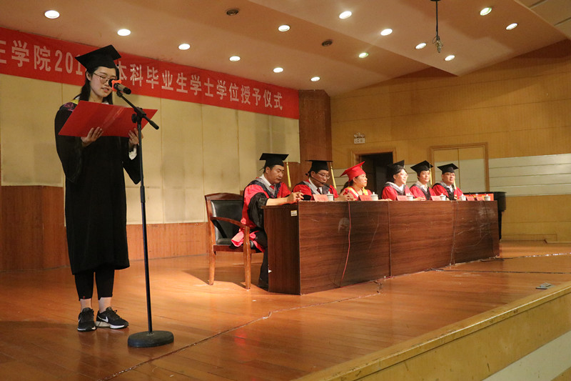 最后,张立华副院长在毕业典礼上发表了热情洋溢的致辞。张院长对2018届毕业生顺利毕业、取得学士学位表示祝贺。他勉励毕业生:一、不要忘记做人,不管是工作还是学习,要先做人再做事。二、不要忘记奋斗,人生是用来奋斗的,幸福是奋斗出来的,所有成功都不是轻轻松松就能实现的,永远不要停下奋斗的脚步。三、不要忘记学习,当今社会知识更新非常快,只有不断学习才能跟上时代的步伐,学习永远在路上。四、不要忘记感恩,要有家国情怀,不管事业大小与成败,要做有责任有担当的人,首先要感恩和回报生你养你的父母,要爱你的爱人和子女,要感恩我们的祖国,要感恩我们的社会。