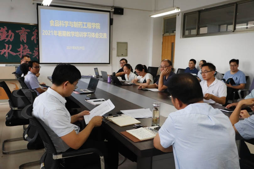 交流活动分两阶段进行,第一阶段制药工程教研室程灿玲主任和梁井瑞老师,为全体教师分享参加全国“制药工程实习类课程”培训的学习体会。第二阶段开展主动应对疫情提升混合式教学能力”专题线上教学培训学习交流,张沛等教师代表分别就个人参加“线上线下混合式教学”培训和进行线上线下混合式教学的做法为大家做了专题分享。