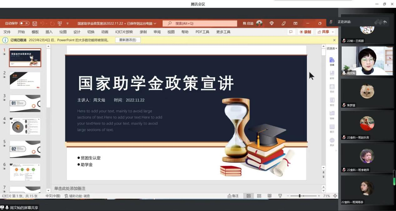 为全面推进资助育人,增强资助政策的宣传力度,增进学生对资助政策的了解和认识,bat365官网登录入口于11月22日在线上举办国家助学金政策宣讲会。本次会议由学院辅导员周文灿老师担任主讲,2022级全体学生参加。