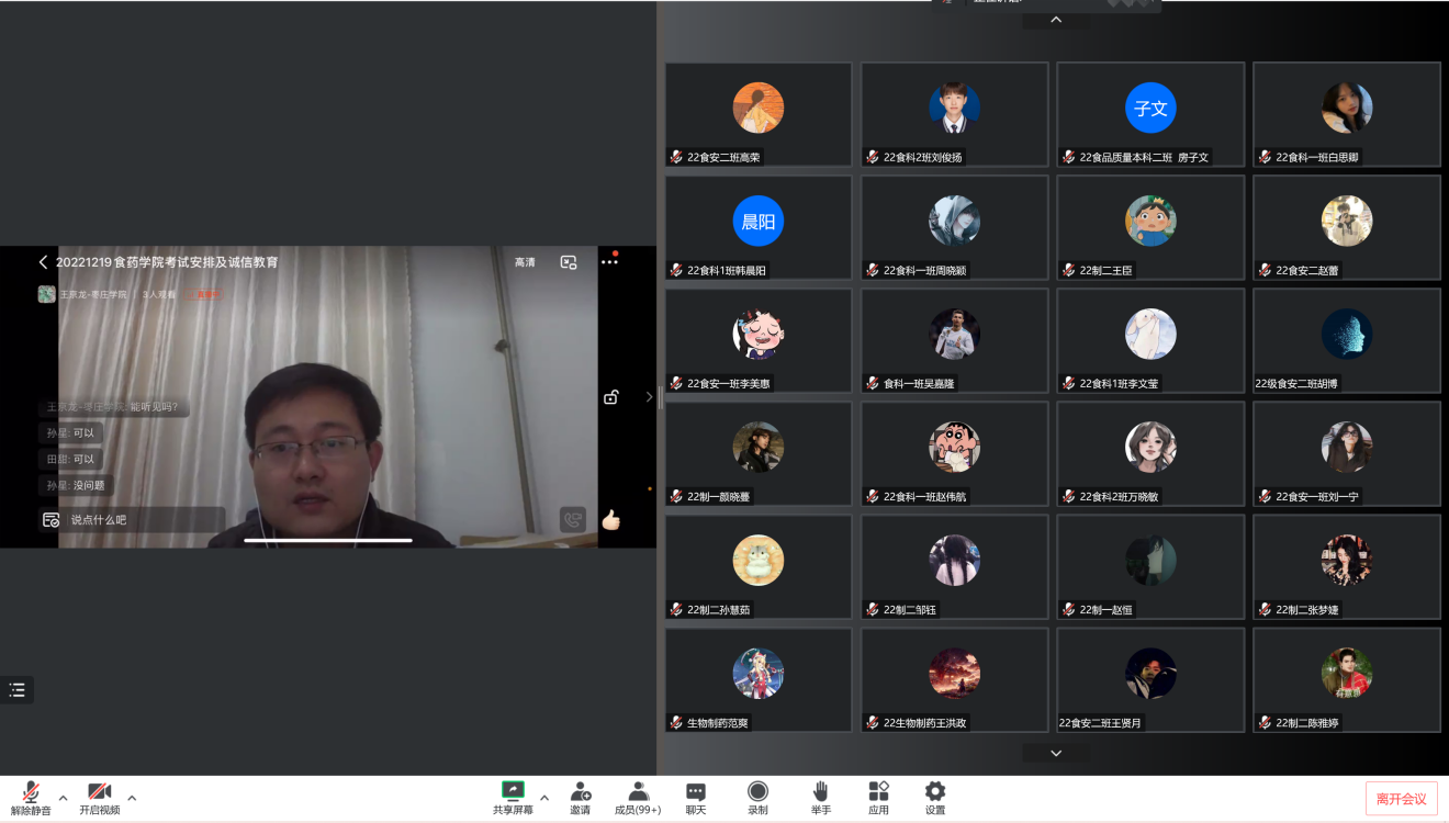 为进一步加强学生考风考纪教育,营造诚信应考的良好氛围,bat365官网登录入口于12月19日晚召开了期末线上考试培训暨考风考纪教育会议。本次会议采取腾讯会议线上进行,由学院副院长王京龙主讲,各年级辅导员、班主任、2020-2022级全体学生参加。